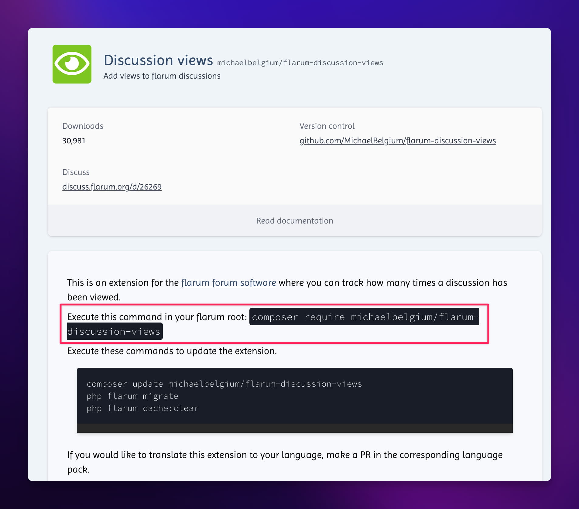 For example, to install the "Discussion views" plugin, even if the official page shows composer require michaelbelgium/flarum-discussion-views: